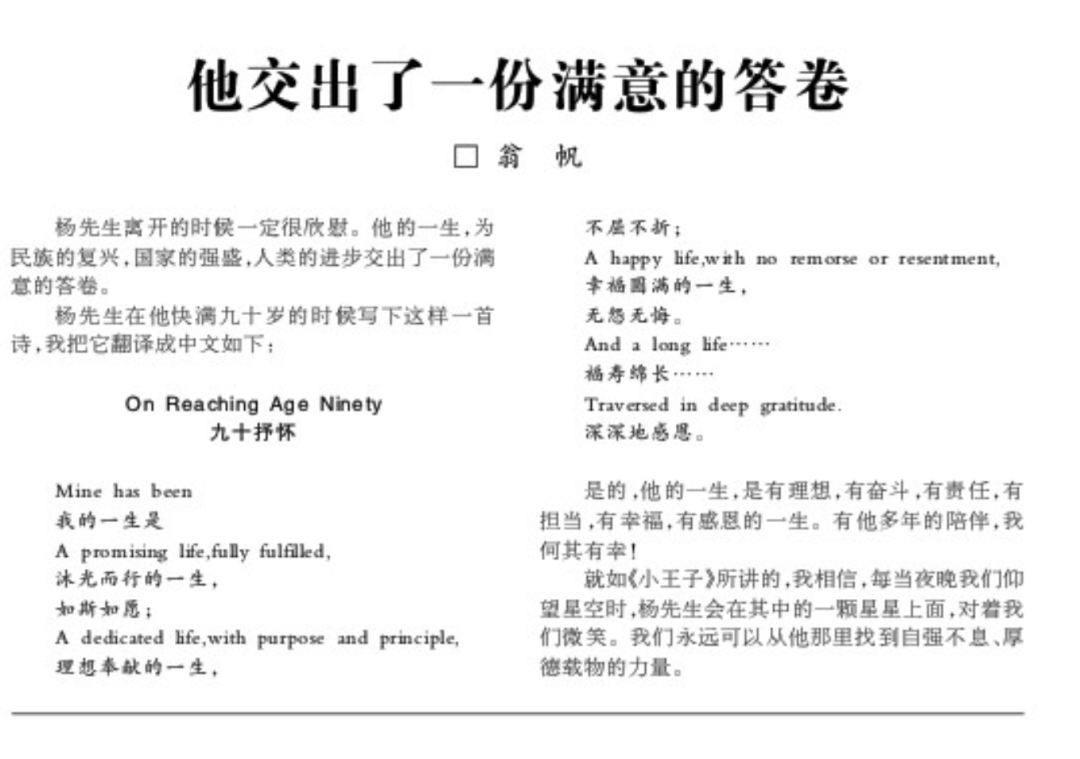 As Mr Yang approached his ninetieth birthday, he wrote a poem titled 'On Reaching Age Ninety', which I have translated into Chinese. It reads: